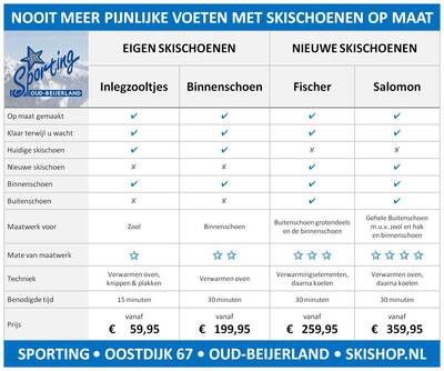 Sporting Oud-Beijerland biedt verschillende oplossingen om uw skischoenen op maat te maken. Pijnlijke voeten met skiën door uw skischoenen zijn niet meer nodig, zodat u écht kunt genieten van uw wintersport. Inlegzooltjes of een nieuwe binnenschoen voor uw huidige skischoenen of een nieuwe maatwerk skischoen. Bij Skishop Sporting Oud-Beijerland vind u alle maatwerkoplossingen.